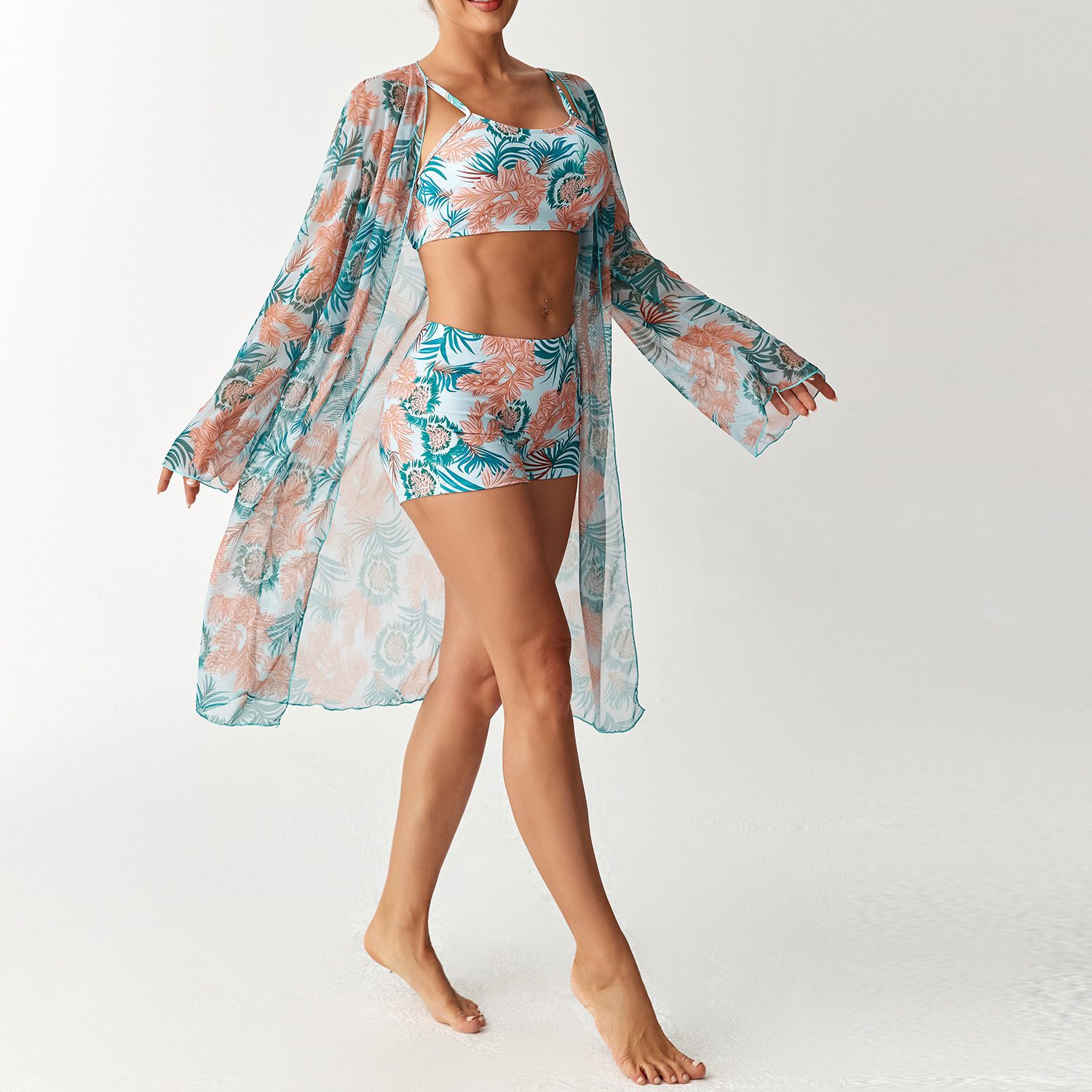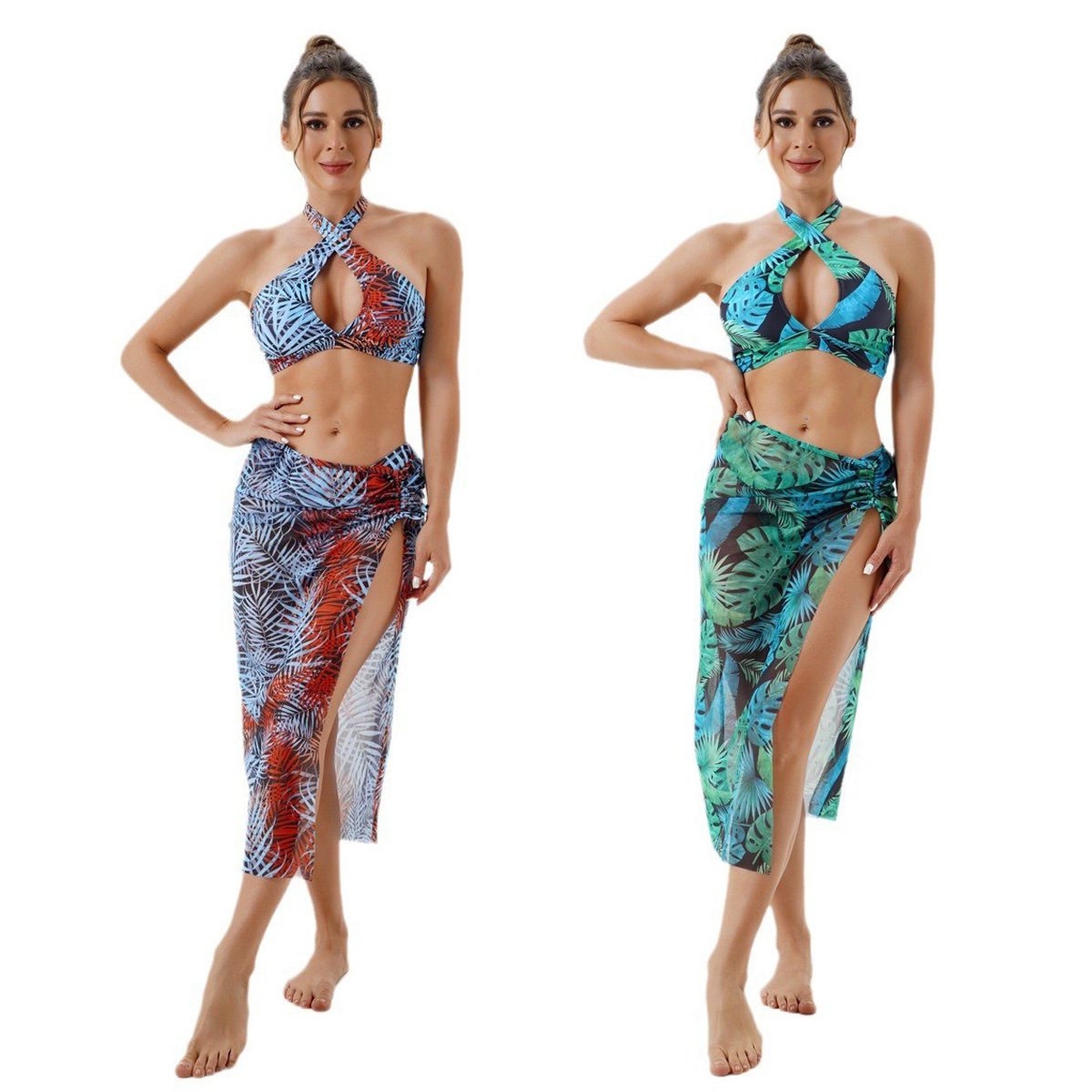 Includes 3 pieces: breast-wrapped top, mesh skirt, and bikini bottoms