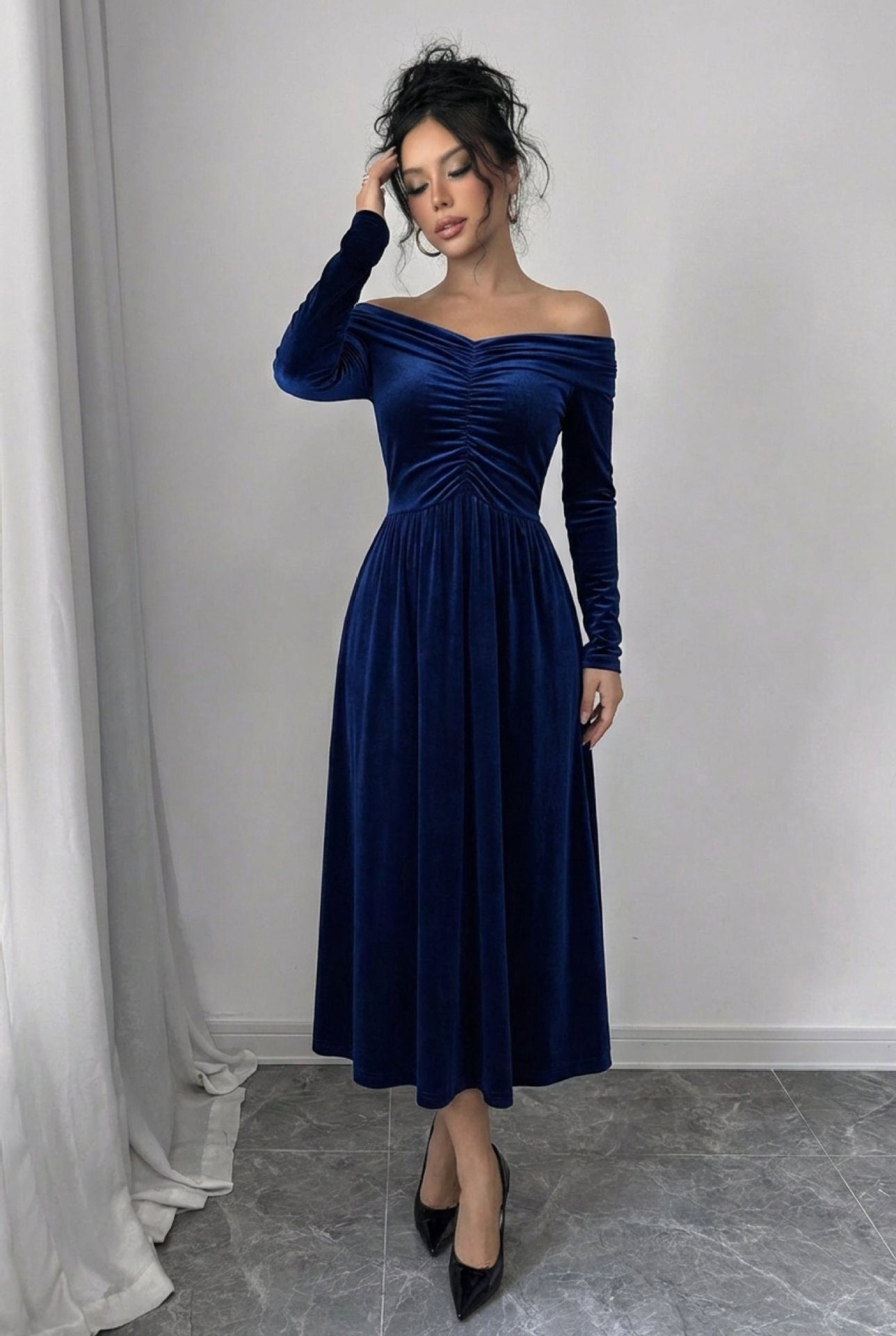 Off-shoulder neckline adds a sultry touch