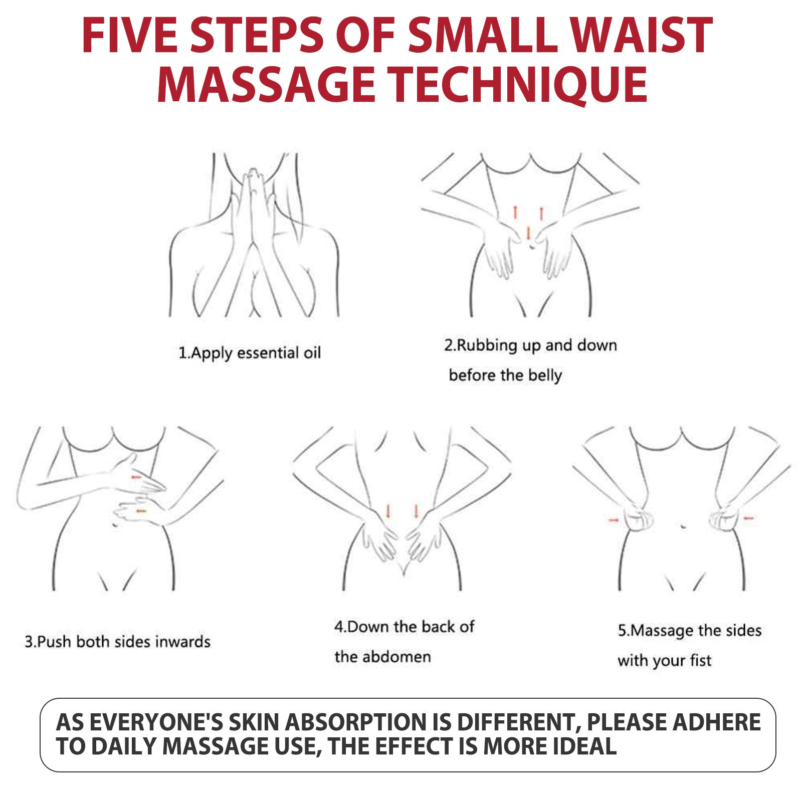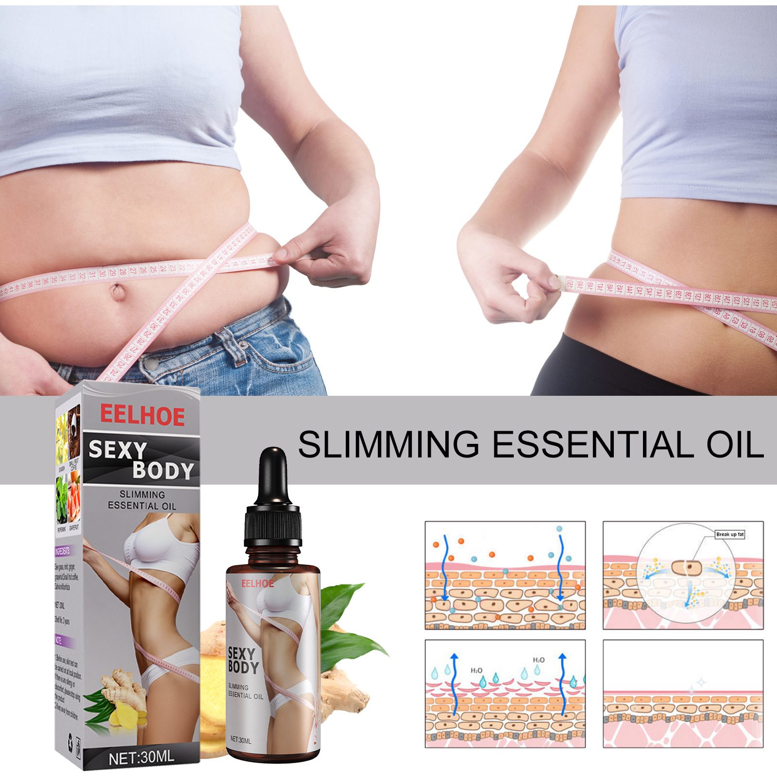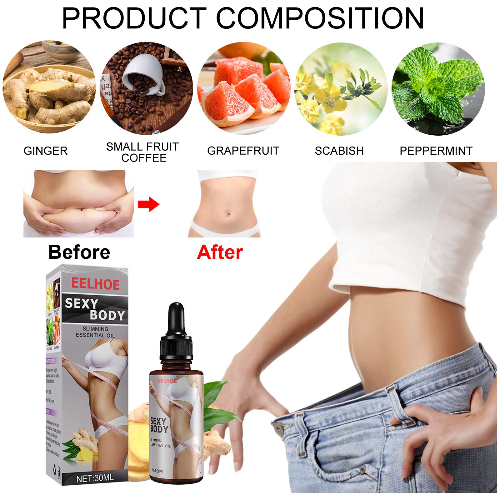 Our body shaping essential oil contains ginger, small fruit coffee, and grapefruit. It helps promote circulation, accelerate metabolism, and burn calories. Its usage is simple: 1. Pour the oil onto your hands. 2. Rub up and down in front of the abdomen. 3. Push both sides inward. 4. Along the back of the abdomen. 5. Use fists to massage both sides of the body. After use, it promotes circulation, accelerates metabolism, burns calories, and burns excess fat. At the same time, natural essential oils can provide nutrients for cells, activate cells, tighten the skin, and make the skin firm and elastic.