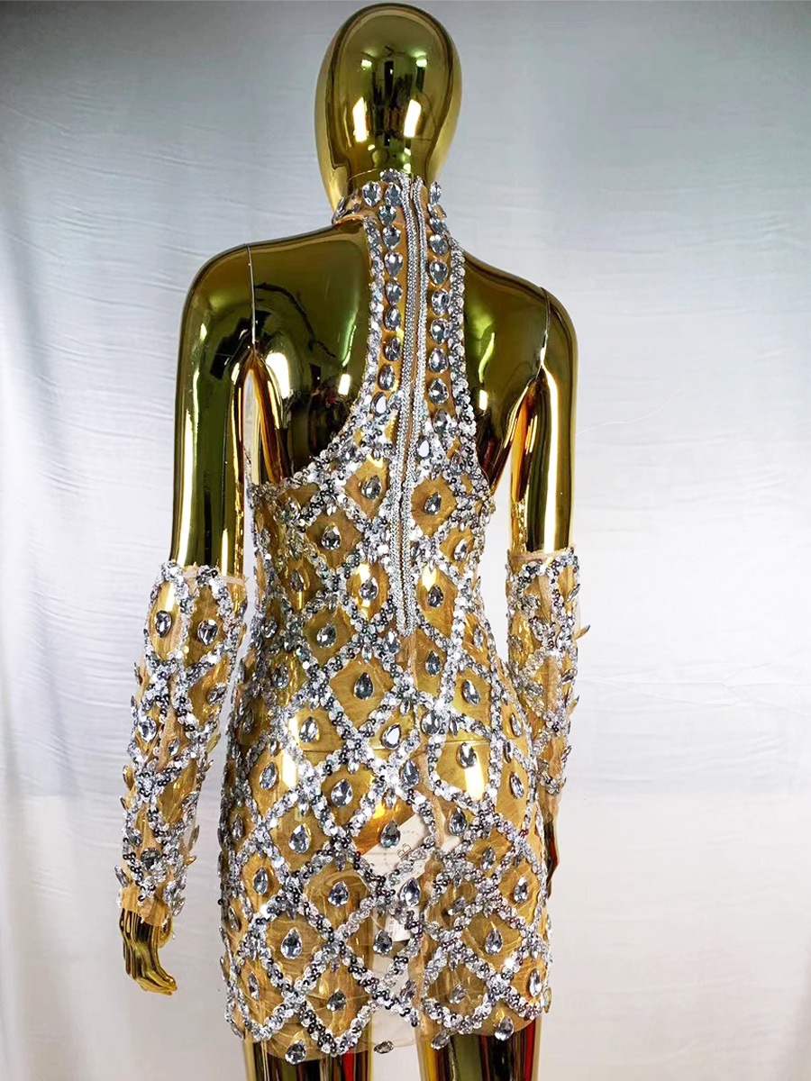 High-end Women’s Heavy-duty Rhinestone Plaid Sequined Gloves Ultra-short Dress