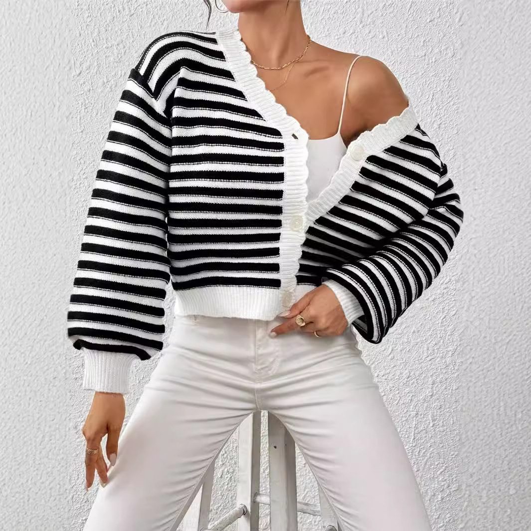 Knitted Cardigan Colorblock Sweater Coat Women’s Rainbow Striped Lantern Sleeve