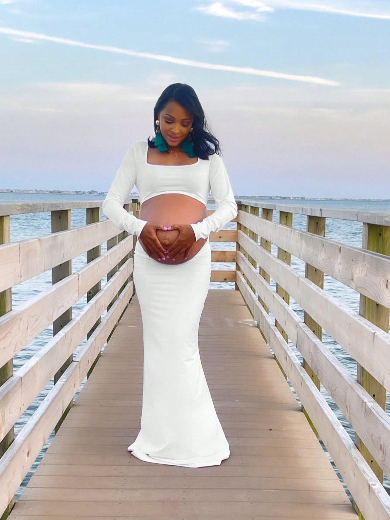 The fabric stretches perfectly around the bump — very flattering.