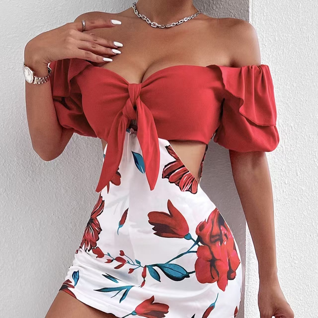 Women’s Off-Shoulder Floral Knot Jumpsuit
