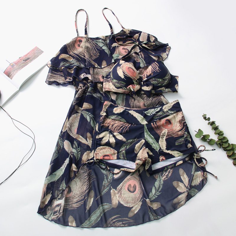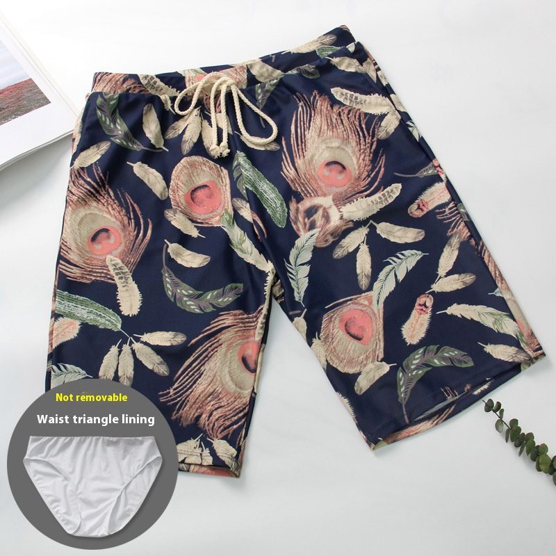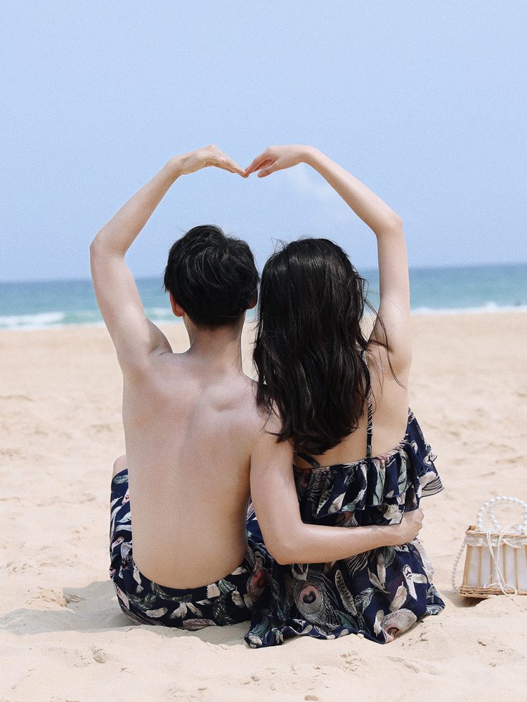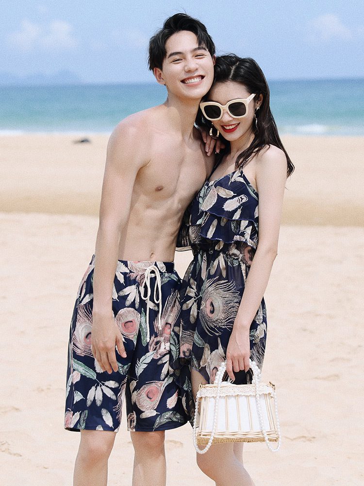 Color: dark blue pattern women’s swimsuit, dark blue pattern men’s beach pants