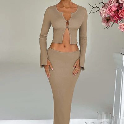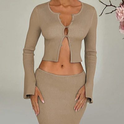 Be the first to review “Short Long Sleeve Cardigan Top Split Skirt Suit Women”