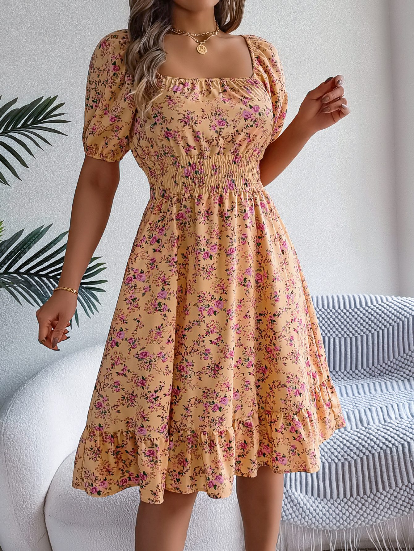 Be the first to review “Women’s Floral Print Square Neck Short Sleeve Tie Waist Ruffle A-Line Dress” Cancel reply